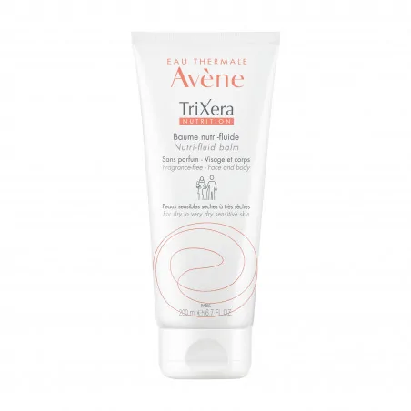 Grâce à l’association trio lipidique végétal, Sélectiose (actif breveté Pierre Fabre) et à l’Eau thermale d’Avène, aux propriétés apaisantes et anti-irritantes, ce soin sans parfum apaise les tiraillements et hydrate pendant 48h*. TriXera NUTRITION Baume Nutri-fluide nourrit, protège et répare la barrière cutanée des peaux sensibles sèches à très sèches de toute la famille. Avec sa texture fluide, non grasse et non collante, l’application est facile et l’habillage express. *Couches supérieures de la peau. • NOURRIT grâce au trio lipidique végétal et Sélectiose. • PROTÈGE et offre une hydratation 48h*. • RÉPARE et restaure la barrière cutanée. Etalez le Baume nutri-fluide entre les 2 mains, l’appliquer délicatement avec toute la surface de la main et en faisant de larges mouvements circulaires.