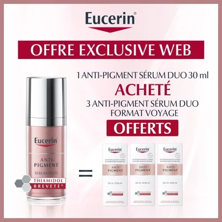 EUCERIN Anti-pigment Sérum Duo 30ml. Eucerin ANTI-PIGMENT Sérum Duo réunit deux sérums qui fonctionnent différemment : • Le Thiamidol* : un ingrédient hautement efficace et breveté qui agit à la source de l’hyperpigmentation, cliniquement prouvé, il réduit l’hyperpigmentation en empêchant sa réapparition grâce à une utilisation régulière. • L’Acide Hyaluronique concentré : l’une des substances hydratantes les plus efficaces pour aider la peau à capter et retenir l’eau. Cet ingrédient cliniquement prouvé atténue les taches et prévient leur réapparition tout en améliorant l’aspect de la peau. Les premiers résultats sont visibles dès deux semaines**. La peau est lisse et semble régénérée, elle devient uniforme, radieuse et éclatante. Des premiers résultats visibles dès deux semaines Eucerin ANTI-PIGMENT Sérum Duo contient de l’Acide hyaluronique concentré qui améliore l’hydratation de la peau. Il a été formulé pour renforcer l’efficacité des hydratants réducteurs de pigments. Pour de meilleurs résultats, il est recommandé de l’utiliser en association avec d’autres produits de la gamme Eucerin ANTI-PIGMENT. *Thiamidol breveté (EP 2 758 381 B1) France, Belgique, Pays-Bas, Maroc.** Evaluation clinique pendant 12 semaines sur 34 volontaires, application conjointe des soins Eucerin® Anti-Pigment Sérum Duo et Soin de Jour SPF30 2 fois par jour pendant 12 semaines. COMPOSITIONS & INGRÉDIENTS : La liste des ingrédients peut être soumise à des variations, nous vous conseillons de toujours vérifier la liste figurant sur le produit acheté. Formule INCI : Aqua, Alcohol Denat., Butylene Glycol, Glycerin, Octocrylene, Isopropyl Palmitate, Cetearyl Isononanoate, Distarch Phosphate, Methylpropanediol | Isobutylamido Thiazolyl Resorcinol, Sodium Ascorbyl Phosphate, Sodium Hyaluronate, Glycyrrhiza Inflata Root Extract, Tocopherol, Glucosylrutin, Sodium Stearoyl Glutamate, Glyceryl Stearate, Sodium Polyacrylate, Dimethicone, Isoquercitrin, Citric Acid, Sodium Chloride, Trisodium EDTA, Caprylyl Glycol, Phenoxyethanol, Parfum. Appliquez des produits contenant du Thiamidol au maximum 4 fois par jour.Évitez le contact avec les yeux. Ne pas conserver à plus de 25°C. CONSEILS D’UTILISATION : Appliquez délicatement matin et soir sur l’ensemble de votre visage nettoyé, avant votre crème hydratante.Pour de meilleurs résultats, utilisez ce sérum en association avec Eucerin ANTI-PIGMENT Soin de Jour SPF 30, Eucerin ANTI-PIGMENT Soin de Nuit et Eucerin ANTI-PIGMENT Correcteur de Taches.Appliquez chaque produit une fois par jour. Nous vous conseillons de ne pas dépasser quatre applications de produits contenant du Thiamidol par jour. Zoom sur la gamme anti-pigment Si vous souhaitez avoir une peau uniforme et éclatante : rien de tel que la gamme anti-pigment créée par la marque Eucerin. Le soleil, les variations au niveau des hormones et le vieillissement cutané sont susceptibles de déclencher une hyperpigmentation ou du mélasma : ce sont des taches brunes également appelées taches de vieillesse (ou encore taches solaires) qui donnent à la peau un aspect qui peut parfois être inesthétique. La gamme Eucerin Anti-Pigment a été spécialement conçue pour réguler ce syndrome d’hyper pigmentation pour vous offrir un épiderme plus uniforme et un teint radieux. Fabriquée à partir d’une substance clé brevetée par les laboratoires Eucerin, le Thiamidol, cette gamme vous propose une crème hydratante, une crème de nuit, un double sérum et un correcteur de taches précis pour traiter l’hyperpigmentation. Les crèmes de jour teintées légères et moyennes contiennent également un filtre SPF 30 et UVA, tandis que le sérum perfecteur de peau est conçu pour stimuler l’éclat naturel de votre peau. Suite à de nombreux tests en laboratoire, il a été cliniquement prouvé que la gamme innovante Anti-Pigment d’Eucerin réduit les taches brunes telles que les taches de vieillesse causées par l’exposition au soleil et les empêche de réapparaître. L’ingrédient très efficace Thiamidol réduit la production de mélanine dans la peau, agissant à l’origine de l’hyperpigmentation. Fabriquée à partir de cet ingrédient breveté par Eucerin, la gamme comprend plusieurs produits pour traiter l’hyperpigmentation.