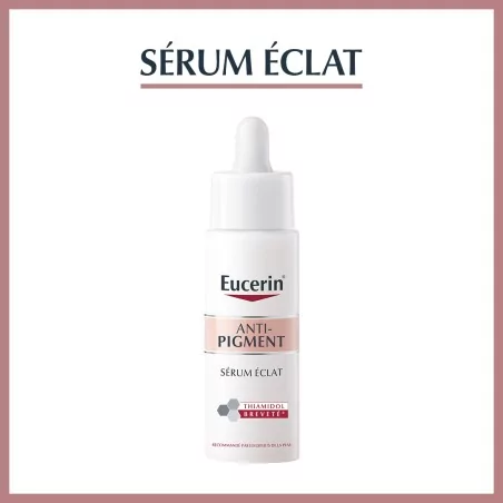 EUCERIN Anti-pigment Serum Eclat-30ml. Eucerin ANTI-PIGMENT Sérum Éclat favorise l’éclat de la peau et réduit l’hyperpigmentation grâce à la combinaison d’ingrédients actifs puissants. Ce sérum ultra léger, testé cliniquement, contient du Thiamidol* pour réduire les taches brunes et prévenir leur réapparition. La technologie Crystal d’Eucerin ANTI-PIGMENT Sérum Éclat garantit une texture ultra légère qui convient à tous les types de peau et peut être ajoutée à n’importe quelle routine de soin. Il pénètre rapidement et laisse une sensation de douceur sur la peau. Un teint unifié et d’un éclat naturel Le Sérum Éclat est cliniquement et dermatologiquement prouvé pour réduire les taches brunes et prévenir leur réapparition tout en donnant plus d’éclat à votre peau. Les premiers résultats sont visibles après deux semaines** et s’améliorent continuellement avec une utilisation régulière. La peau paraît plus lisse, uniforme et éclatante. À savoir, le Sérum Éclat ANTI-PIGMENT d’Eucerin peut être combiné avec d’autres produits de la gamme ANTI-PIGMENT Eucerin, comme le Soin de Jour SPF 30 ANTI-PIGMENT. *Thiamidol breveté (EP 2 758 381 B1) France, Belgique, Pays-Bas.**Évaluation clinique, 34 femmes, 2 semaines. COMPOSITIONS & INGRÉDIENTS : La liste des ingrédients peut être soumise à des variations, nous vous conseillons de toujours vérifier la liste figurant sur le produit acheté. Formule INCI : Aqua, Glycerin, Alcohol Denat., Cetyl Alcohol, Dibutyl Adipate, Caprylic/Capric Triglyceride, Dicaprylyl Carbonate, Propylheptyl Caprylate, Isobutylamido Thiazolyl Resorcinol, Sodium Hyaluronate, Tocopherol, Sodium Stearoyl Glutamate, Dimethicone, Carbomer, Phenoxyethanol, Ethylhexylglycerin, Trisodium EDTA, Sodium Hydroxide, Sodium Chloride, Parfum. CONSEILS D’UTILISATION : Appliquez quotidiennement, matin et soir, sur le visage nettoyé, avant votre routine de soin.Utilisez-le seul ou avant l’application de votre crème hydratante habituelle.Utilisez des produits avec du Thiamidol* au maximum 4 fois par jour.Évitez le contact avec les yeux. *Thiamidol breveté (EP 2 758 381 B1) France, Belgique, Pays-Bas.