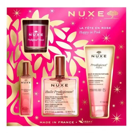 Nuxe Prodigieux Coffret La Fête en Rose est un coffret de trois produits et une bougie qui vous feront succomber à l’intense sensorialité de l’emblématique gamme Prodigieuse Florale aux notes fraîches et délicates : – Nuxe Prodigieux Floral Le Parfum 15 ml est une eau de parfum qui permet de retrouver les notes fraîches et délicates de l’Huile Prodigieuse Florale. Quelques pschitts de ce sillage pétillant et les sens sont transportés par son accord pamplemousse en tête, exaltés par son cœur floral de magnolia, envoutés par la subtilité du musc blanc. Une invitation à l’insouciance et à la légèreté. 89% du total des ingrédients sont d’origine naturelle. – Nuxe Huile Prodigieuse Florale 100 ml est une huile sèche multi-fonctions qui peut s’utiliser aussi bien pour le soin du visage, du corps et des cheveux. Elle nourrit, répare et sublime. Elle s’inspire du parfum mythique de l’huile Prodigieuse et se décline dans un nouveau parfum floral et délicat. Cette huile sèche est formulée à base de principaux actifs d’origine naturelle avec 7 huiles précieuses 100% végétales : l’huile de tsubaki hydratante, l’huile d’argan réparatrice, l’huile de macadamia nourrissante, l’huile de bourrache lissante, l’huile de camélia hydratante, l’huile de noisette protectrice, l’huile d’amande douce adoucissante. Son action anti-oxydante, son effet « bouclier anti-pollution » et son effet sur la réduction de l’apparence des vergetures en font une alliée au quotidien. Sa texture d’huile sèche est un réel plaisir à l’application, elle dévoile un parfum floral et délicat aux notes de zeste de pamplemousse, de magnolia et de musc. – Nuxe Prodigieux Floral Gelée de Douche Parfumée 100 ml est une gelée fraîche et délicate au parfum floral pour un moment de détente sensorielle. Sa base lavante d’origine végétale nettoie en douceur et parfume la peau. – Nuxe Prodigieux Floral Bougie 70 gest une bougie qui vous permettra de retrouver l’atmosphère florale et joyeuse inspirée de la fragrance unique de l’Huile Prodigieuse Florale. Elle est présentée dans son support en verre. Vegan. Fabriqués en France. CONSEIL D’UTILISATION – Le Parfum : Vaporisez le parfum devant vous et entrez dans sa brume parfumée. Ou vaporisez le parfum à quelques centimètres de votre peau en privilégiant le cou et l’intérieur des poignets. – Huile Prodigieuse Florale : Utiliser toute l’année, hiver comme été, sur le visage, le corps et les cheveux : Sur le visage, elle s’applique par mouvements de lissage du centre vers le contour du visage. Elle peut s’utiliser seule ou en mélangeant quelques gouttes dans le creux de la main avec votre crème Nuxe. Sur le corps, elle s’applique en mouvements circulaires (buste, jambes,…) et sur les vergetures. Sur les cheveux, elle s’utilise en huile capillaire sur les longueurs et les pointes aussi souvent que nécessaire. Pour un effet soin intense, elle s’applique une à deux fois par semaine en masque pendant 10 minutes avant le shampoing. – Gelée de Douche : Matin et soir, massez une noix de gel douche parfumé sur votre peau humide puis rincez. Rincez en cas de contact avec les yeux. – Bougie : Suivre attentivement les recommandations. Peut produire une réaction allergique. Garder à vue. Éloigner des objets inflammables. Tenir hors de portée des enfants.